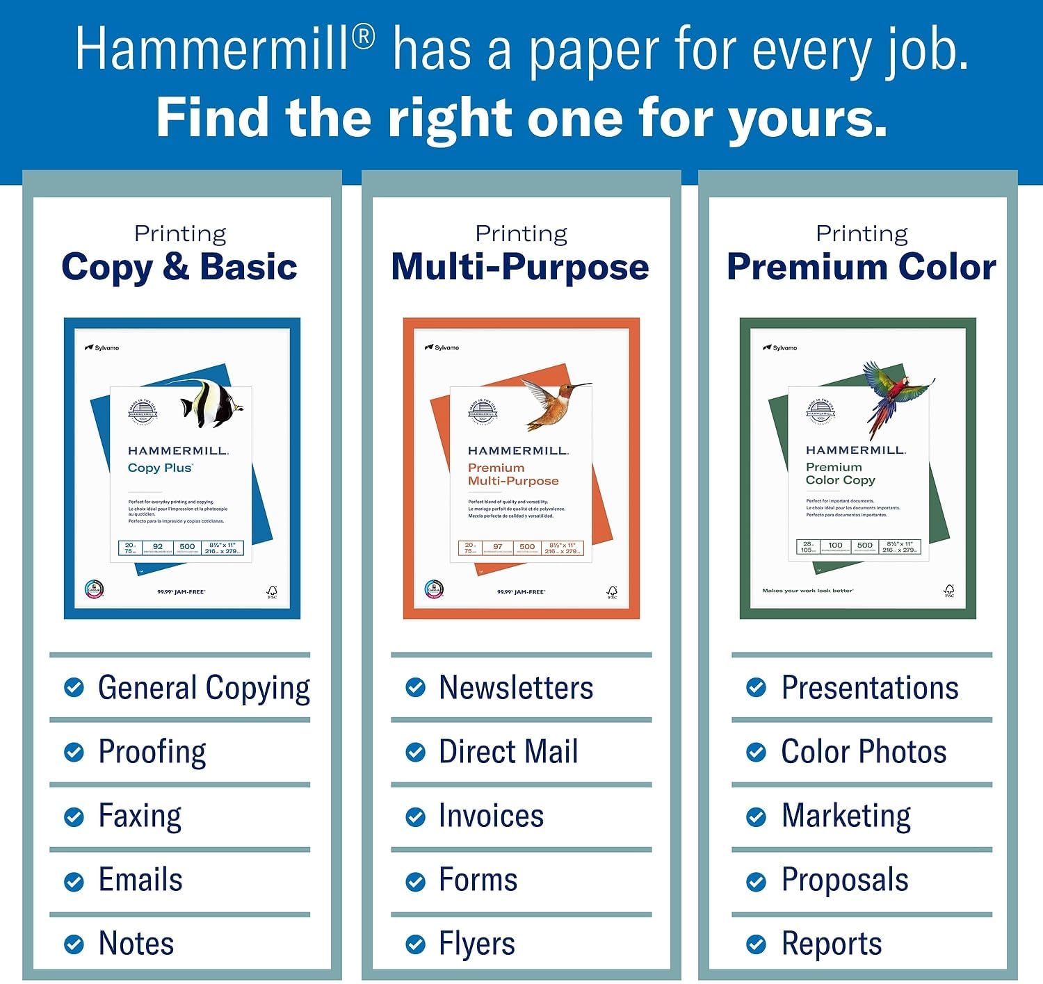 - OTHER PAPER OPTIONS – There’s a Hammermill print and copy paper for every purpose including premium presentation-quality color copy paper, cover-weight paper stock, glossy paper for photo printing, and 15 pastel shades of multipurpose copy paper.