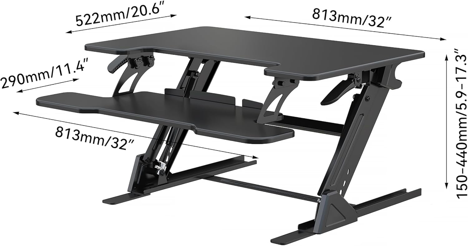 - Spacious 32 inches (81cm)Surface - The 32 x 24 inches (81cm x 56cm) desktop provides room for single and dual monitor/laptop setups. The keyboard tray raises in sync with the top surface to create a comfortable workstation.