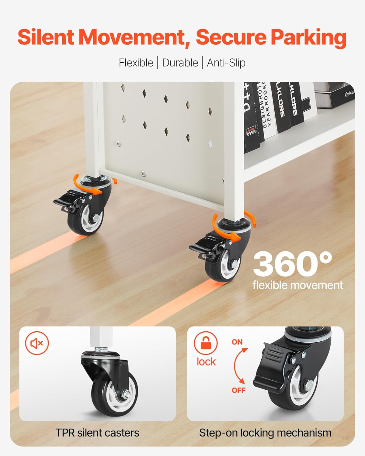 - Silent Movement: TPR silent swivel casters glide smoothly, and two have a locking feature for secure positioning. Move the book truck effortlessly across wood or tile floors without disturbing anyoneâgreat for libraries or nighttime use
